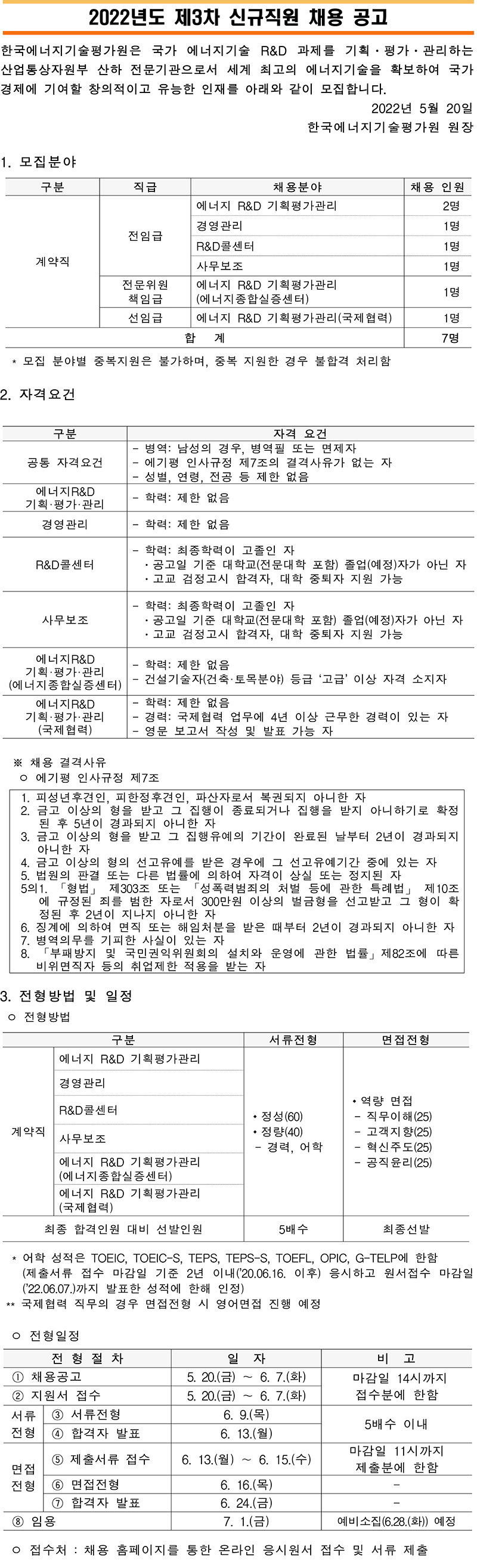 제        목 [한국에너지기술평가원] 2022년도 제3차 신규직원 채용 공고