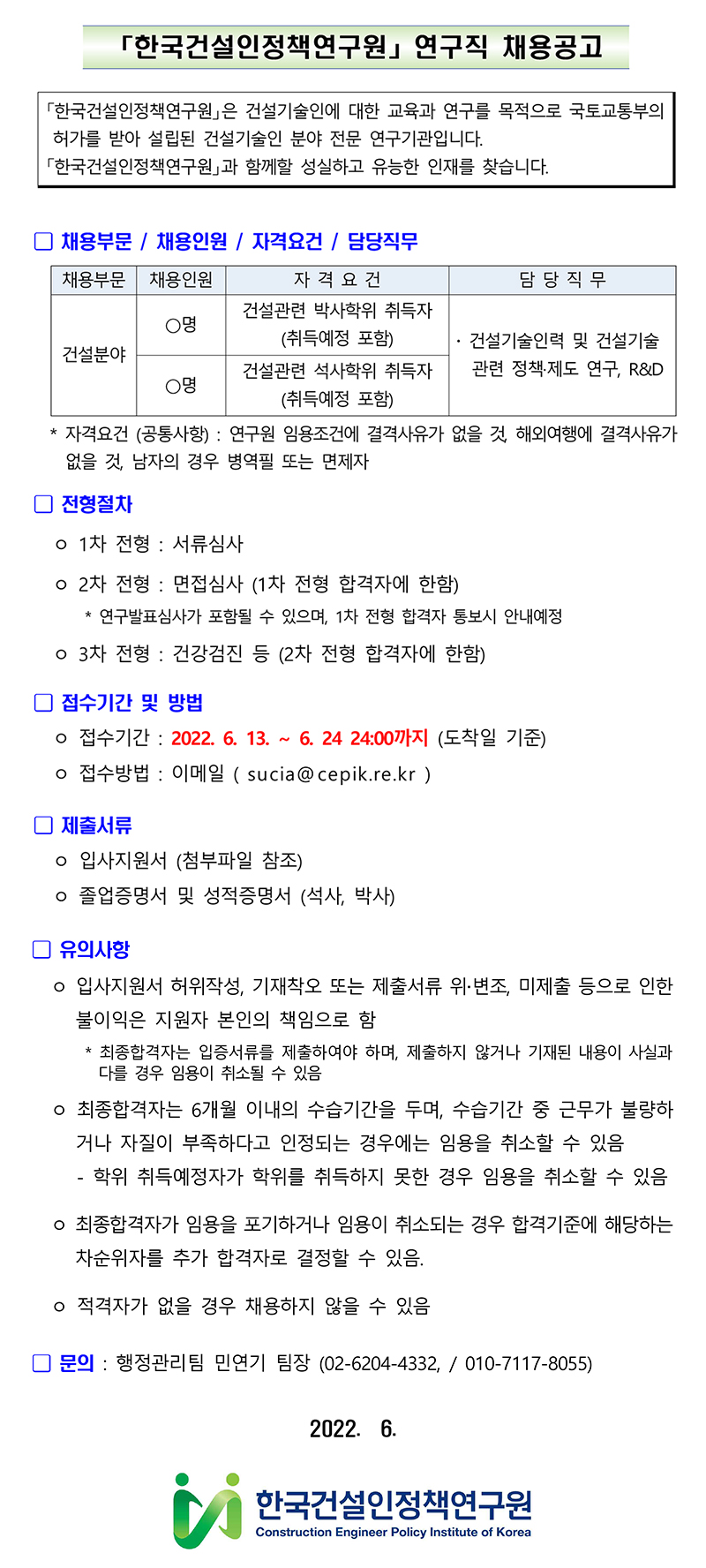 제        목 [한국건설인정책연구원] 연구직 채용 공고
