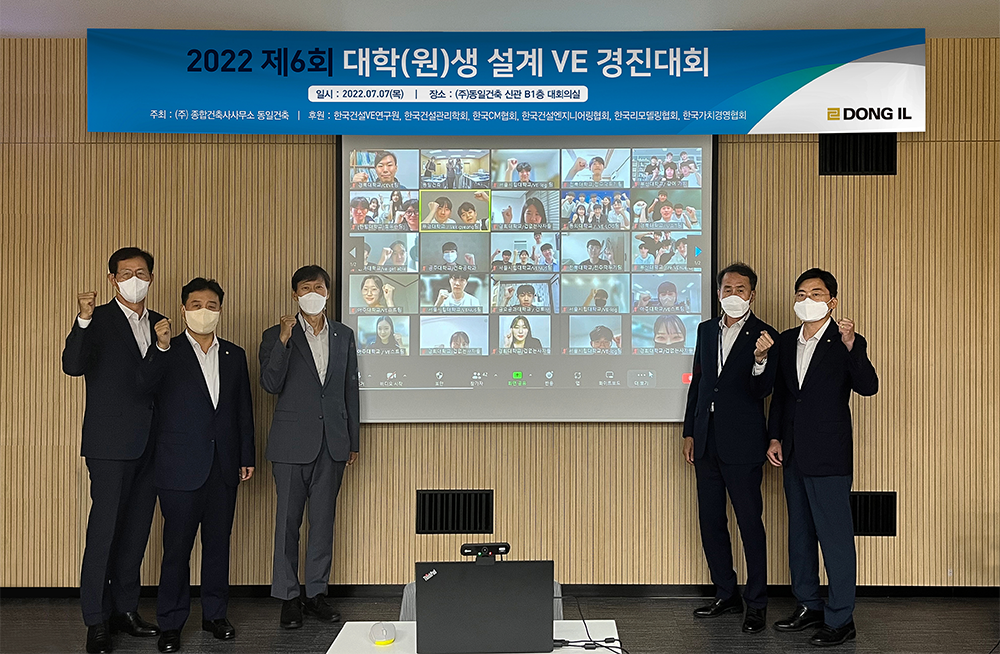 당사는 전국 대학(원)생을 대상으로 2012년, 2014년, 2016년, 2018년, 2020년에 이어 “2022년 제6회 대학(원)생 설계VE 경진대회”를 개최하였습니다. 전국 22개 대학의 31개팀이 설계VE 경진대회 참가신청을 하였고 19개 대학 24개팀이 설계VE제안서를 제출하여 예선심사를 통해서 12개 대학 15개팀이 결선진출팀으로 선정되었으며, 2022년 7월 7일 동일건축 대회의실에서 화상회의시스템을 활용하여 결선심사를 비대면방식으로 실시하였습니다. 대상(상장과 상금 300만원)은 동의대학교 VE-LOG팀, 최우수상(상장과 상금200만원)은 서울시립대학교 VENUS팀, 경북대학교 CEVE팀, 우수상(상장과 상금 100만원)은 경희대학교 겁없는사자들팀, 부산대학교 re:VEnue팀, 전북대학교 전주깍두기팀, 장려상(상장과 상금 50만원)은 한밭대학교 토우손팀, 부경대학교 백경팀, 공주대학교 국립공주대 건축공학팀, 경북대학교 V.A.T팀, 금오공과대학교/경북대학교 건토사팀, 부산대학교 같이가치팀, 서울시립대학교 VE-log팀, 아주대학교 VEST팀, 인하대학교 ve get able팀이 수상하였고, 설계VE제안서를 제출한 9개팀은 격려상(상장과 상금30만원)을 수상하였습니다.