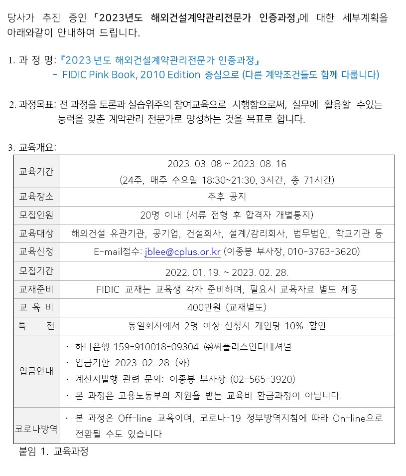 제        목 [씨플러스] 2023년도 해외건설계약관리전문가 인증과정 수강 모집