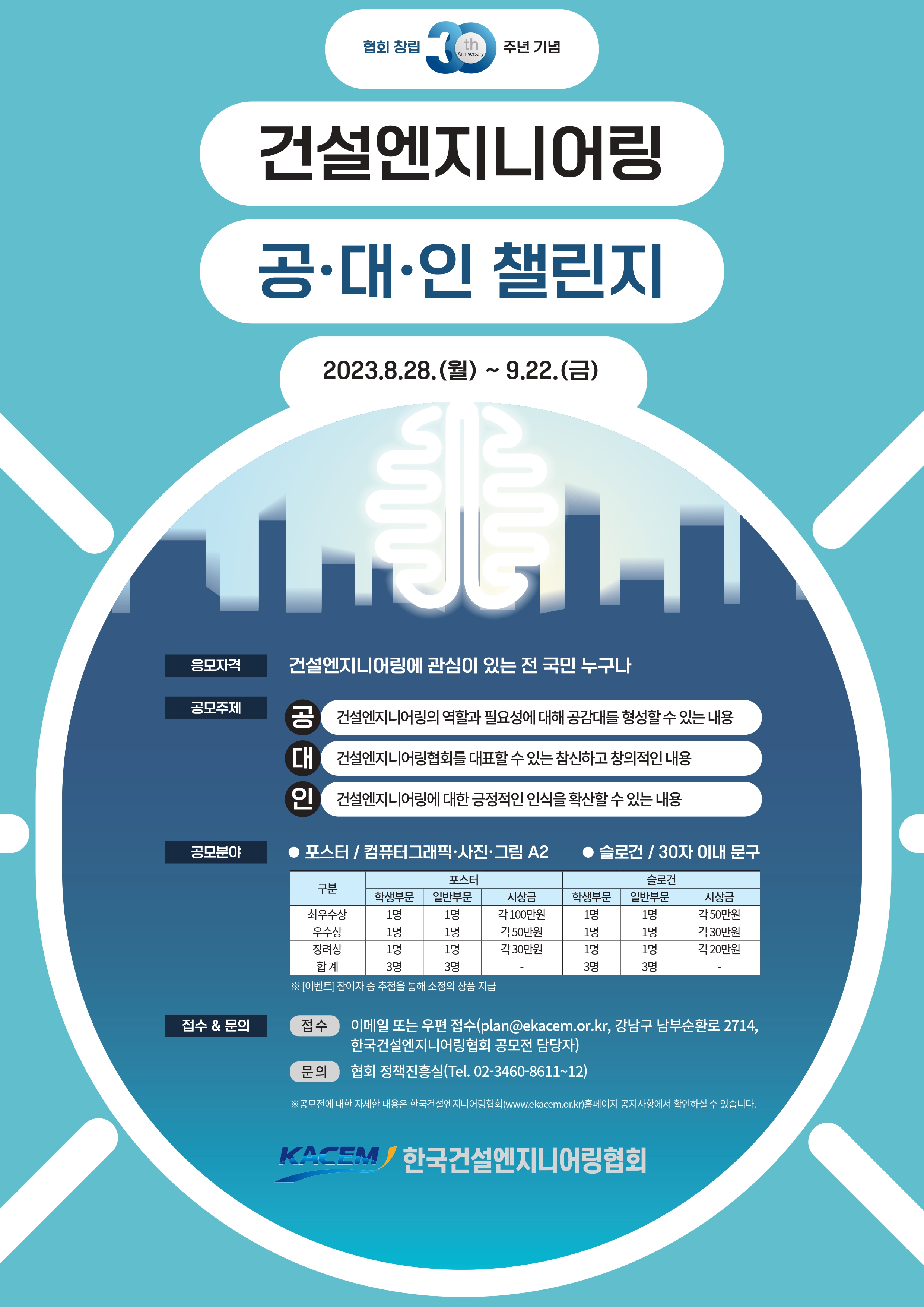 제        목 [KACEM] 협회창립 30주년 기념 "건설엔지니어링 공대인 챌린지"