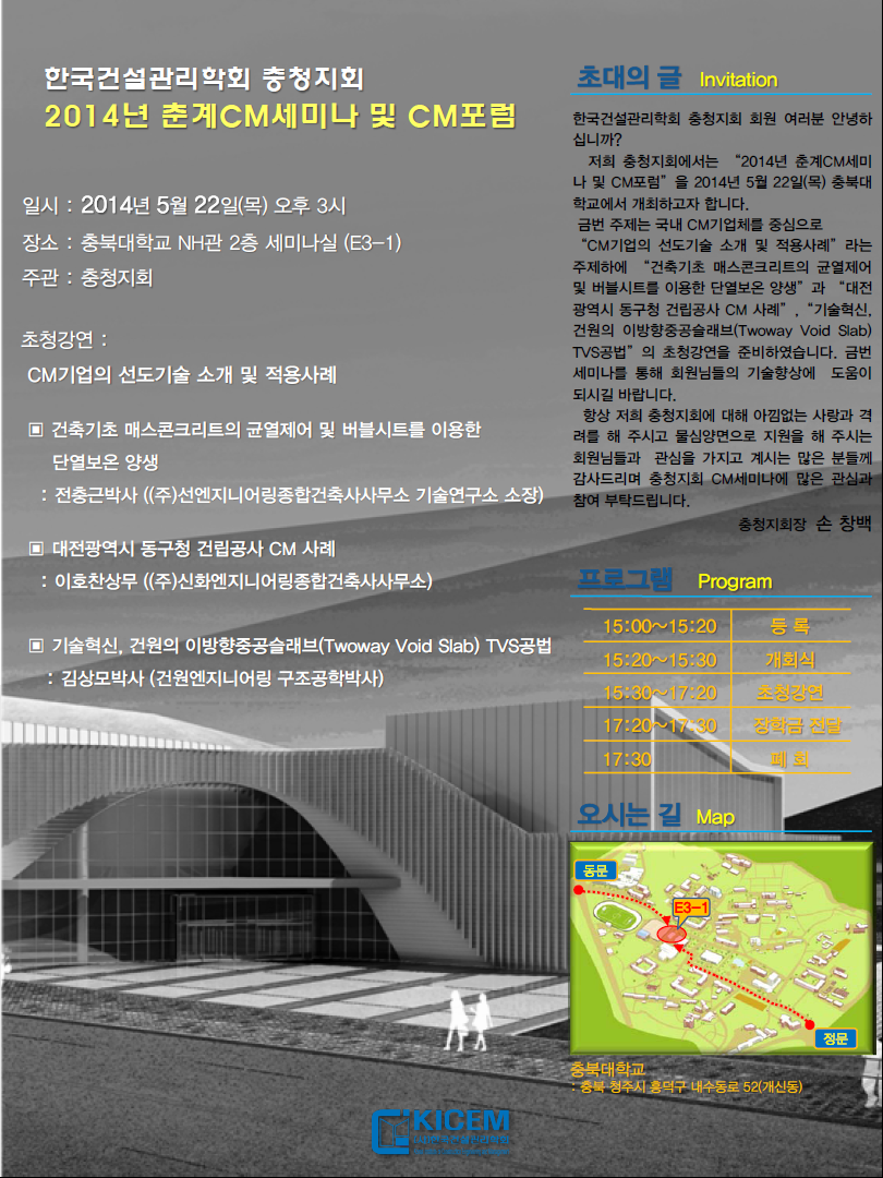 제        목 [충청지회] 2014 춘계CM세미나 및 CM포럼 (5/22)